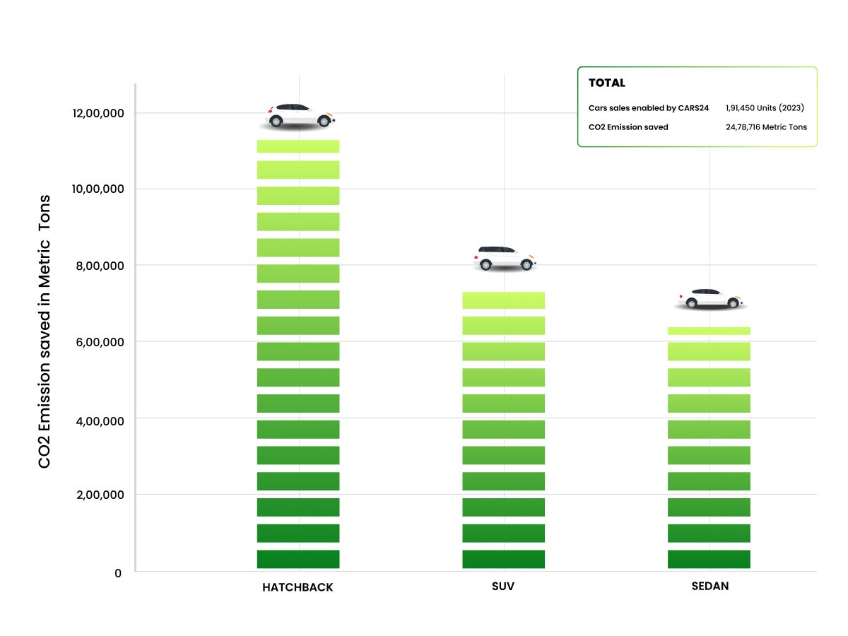 - CO₂ Emissions Reduction: In 2023 alone, Cars24 helped save approximately 2.5 million metric tons of CO₂ by enabling the sale of around 200,000 used cars across body types.