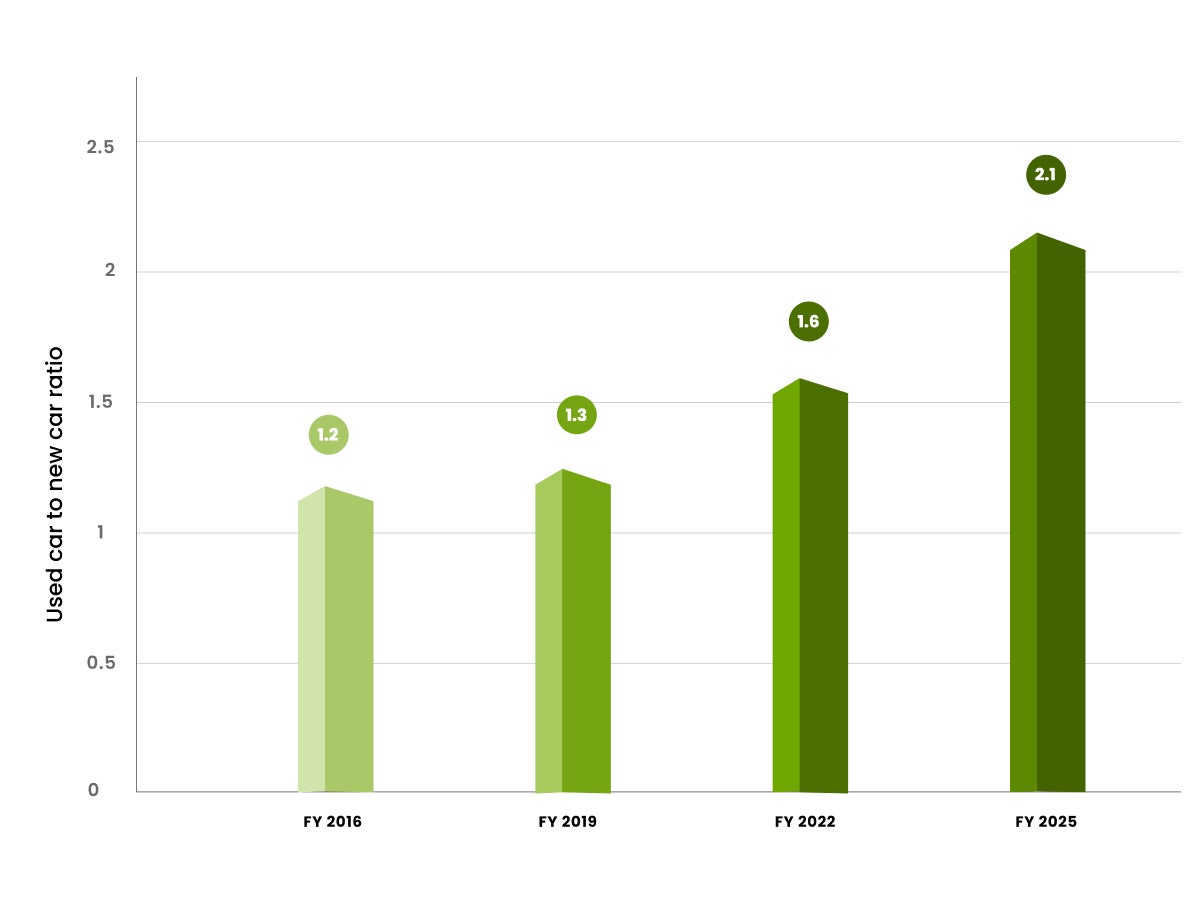 - Market Shift: The Indian used car market is projected to grow from 3.8 million units in 2022 to over 8 million units by 2026, outpacing the new car market growth by more than double. By 2026, the volume of used cars sold is expected to be twice that of new cars, reflecting a significant consumer shift towards sustainability.